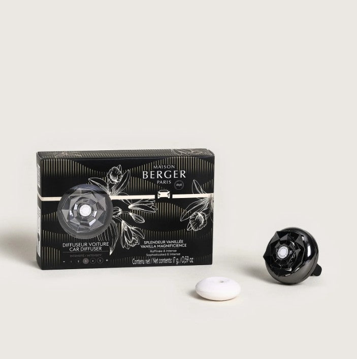 Genere un ambiente cautivador en su vehículo con el Difusor de coche Kali. Su diseño con pétalos en relieve y su color Gun Metal aportan un toque de luminosidad, mientras que el aroma Splendeur Vanillée estimula sus sentidos.